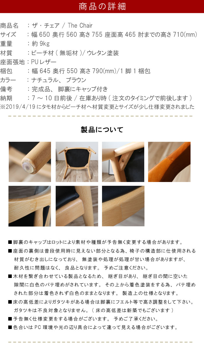 ※1脚のみの販売です 商品名:ザ・チェア/TheChair サイズ:幅650奥行560高さ755座面高465肘までの高さ710(mm) 重量:約9kg 材質:ビーチ材(無垢材)/ウレタン塗装 座面張地:PUレザー 梱包:幅645奥行550高さ790(mm)/1脚1梱包 カラー:ナチュラル、ブラウン 備考:完成品、脚裏にキャップ付き 納期:7〜10日前後/在庫あり時(注文のタイミングで前後します) ※2019/4/19にタモ材からビーチ材へ材質変更とサイズが少し仕様変更されました ※無垢材ですので、1点1点 木目の出方や色合いに個性が有り、同じものはありませんので、ご了承ください。